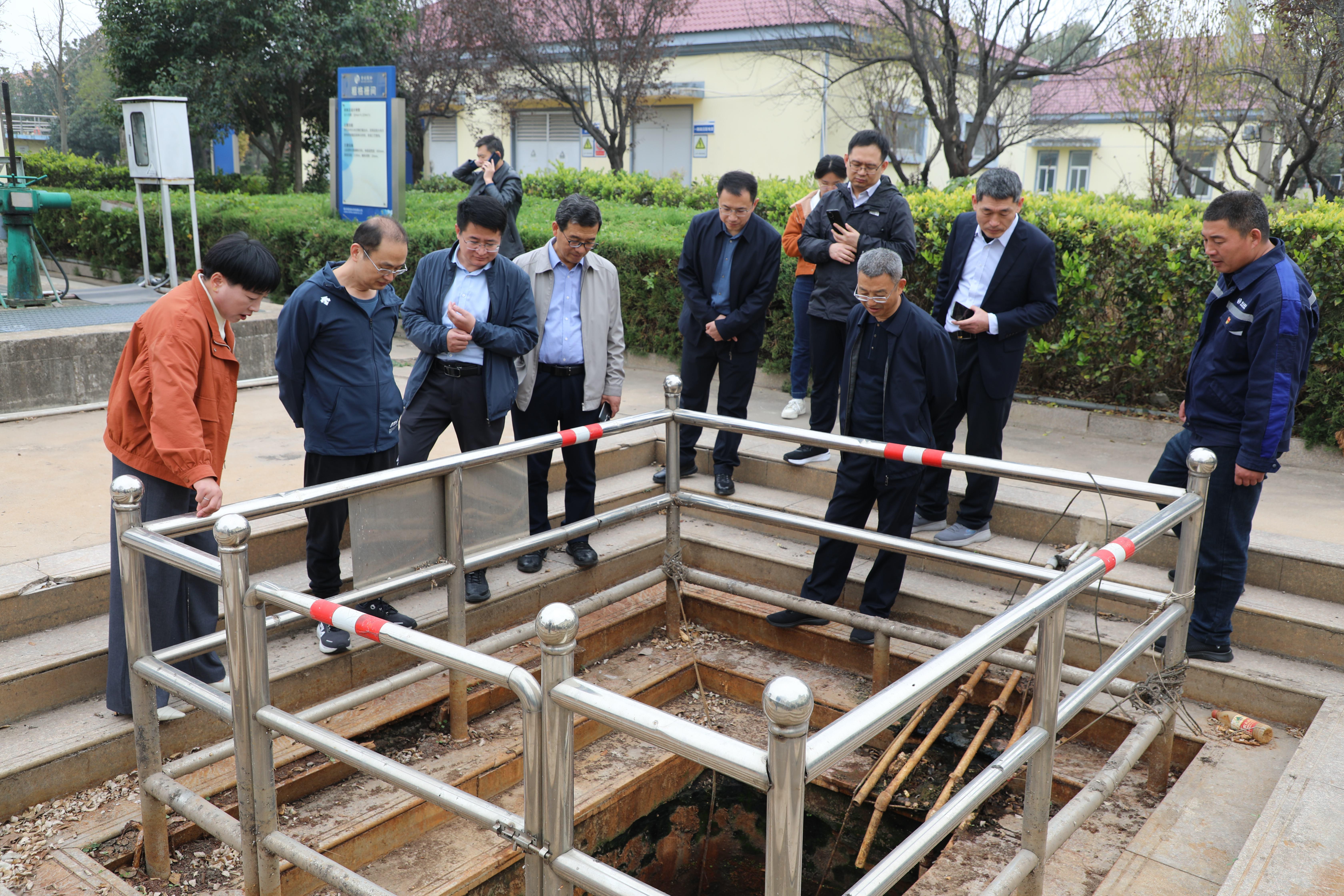 省市领导及专家正在检查城市生活污水处理厂进水口时情景