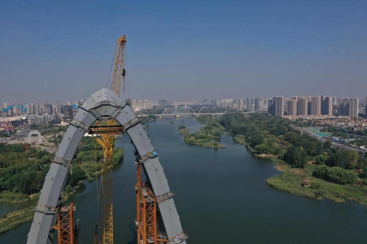 10月1日上午,通达路祊河桥主塔顺利完成合龙。
