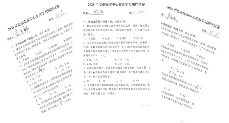 活动传达了2026年度中心业务学习通知,对全年中心培训工作进行部署安排。监督服务一科王作强以《建设工程施工现场消防技术标准》为题作第一讲,学习结束后,中心全体业务人员进行2025年度业务学习集中测评考试。