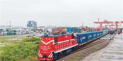 一列满载货物的海铁联运班列从铁路浙江义乌西站开出,驶向宁波舟山港。